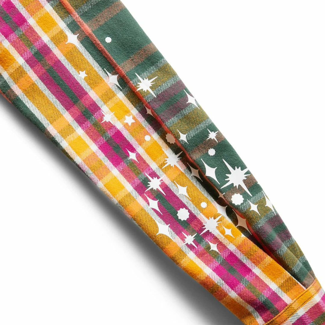 - Button down flannel with print at sleeves, woven label at left chest pocket