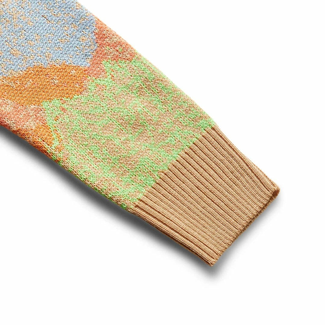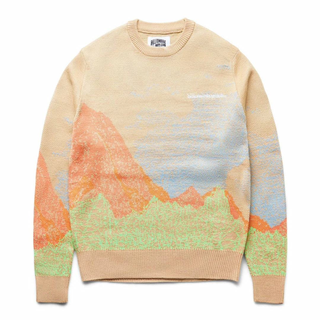 Mountainous terrain is depicted in the pastel jacquard of the Altitude Sweater.