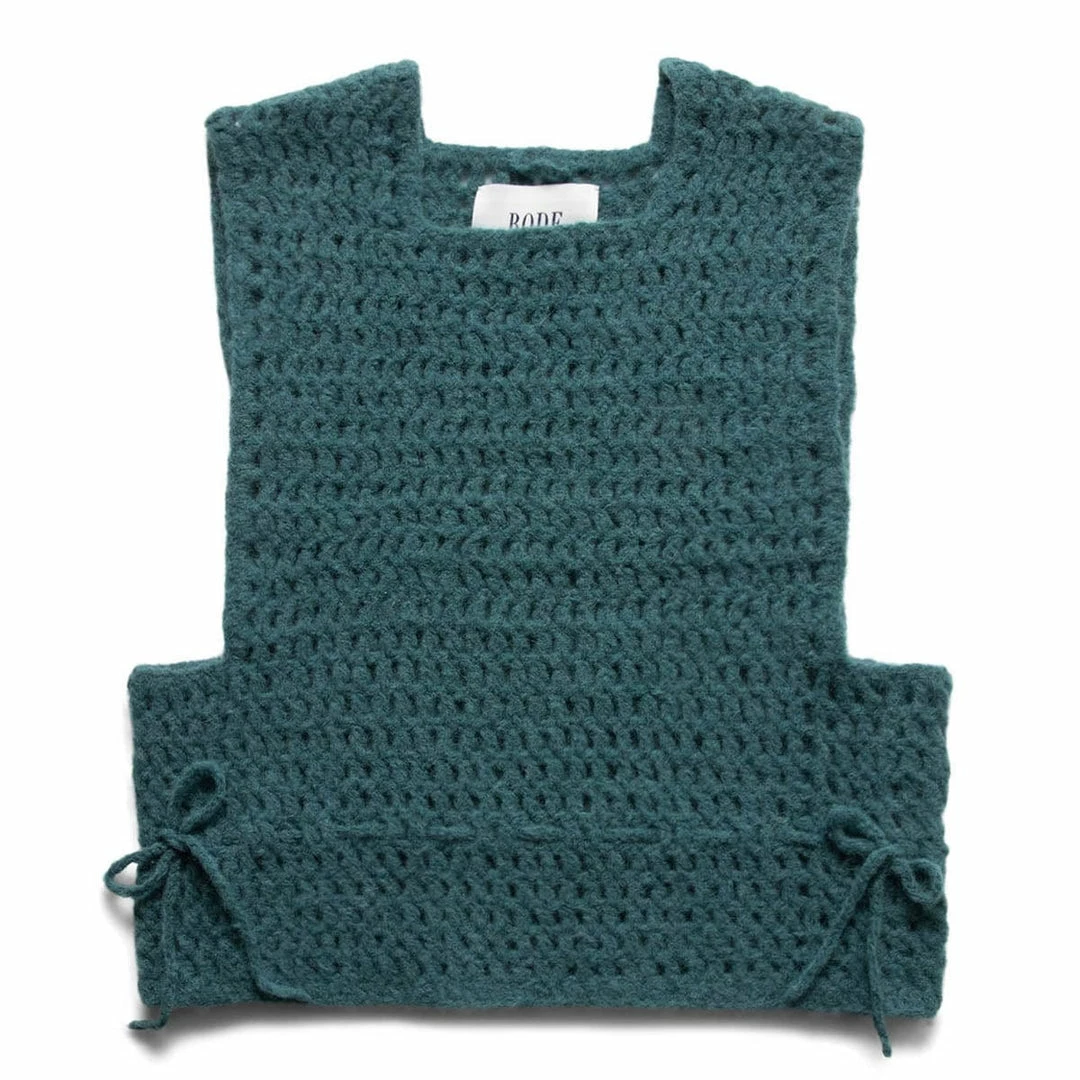 THISΒ VEST IS INSPIRED BY A 1960S MOHAIR VEST. THE SIDE TIE CLOSURES AND CELLULAR CROCHET PATTERN IS FAITHFUL TO THE ORIGINAL. CROCHETED BY HAND IN A WOMAN-OWNED AND OPERATED FACTORY IN PERU.Β