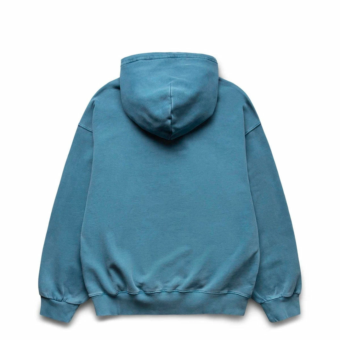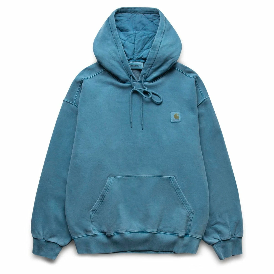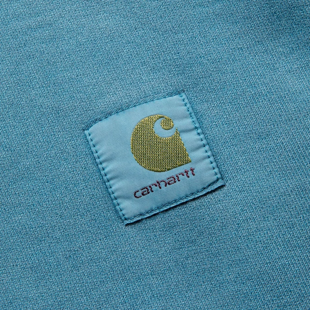 The HoodedΒ Vista Sweatshirt comes in aΒ washed blue with the Carhartt woven labelΒ on the chest.