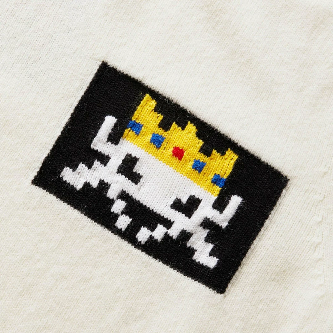 - Invader intarsia artwork on front and back