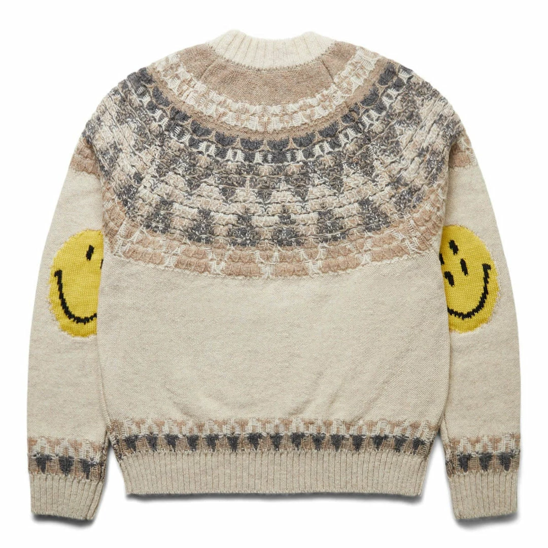 With the reputation as one of the most sought after names in the world of denim and alternate reality Americana, Kapital launched in 1996 and marries impeccable craftsmanship and innovative textile techniques with an intricately detailed, elegantly offbeat signature look, creating some of the most unique, authentic examples of ‘future vintage’ – garments and accessories coveted now that will only become more desirable as time goes on. Cozy up this winter with theΒ 5G wool nordic smile patch raglan sweater.