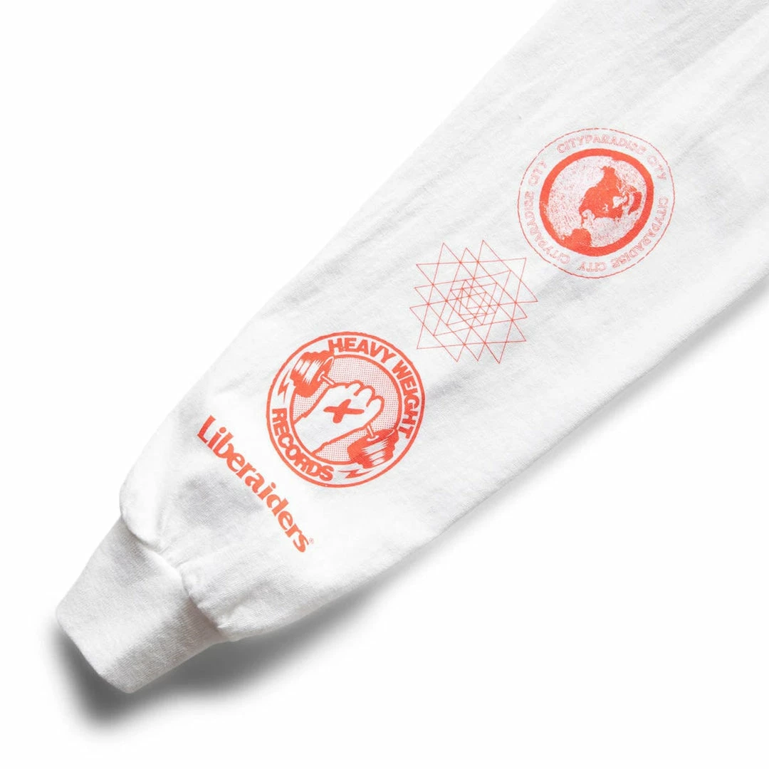 A not-so-basic white cotton long-sleeve crewneck with graphics throughout.