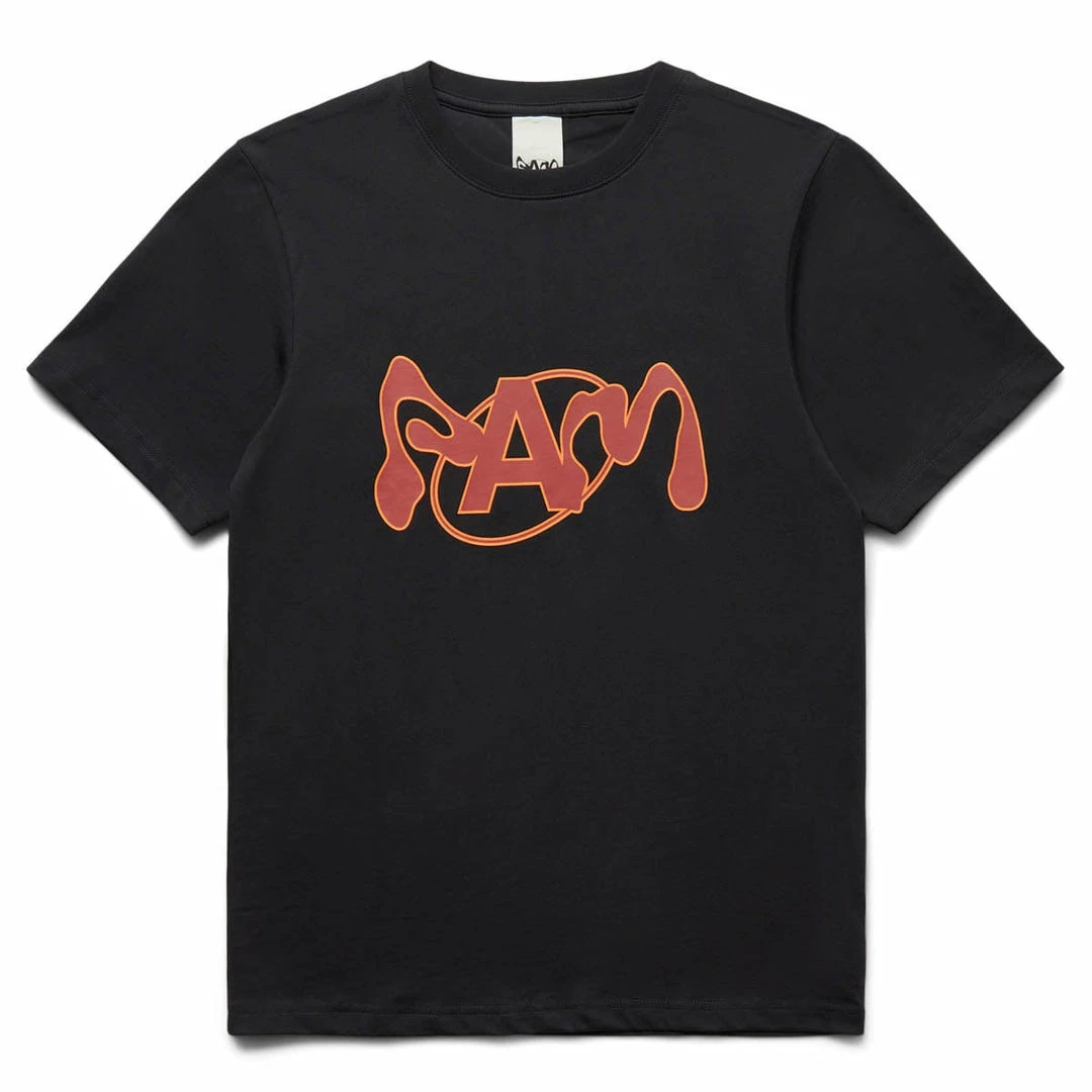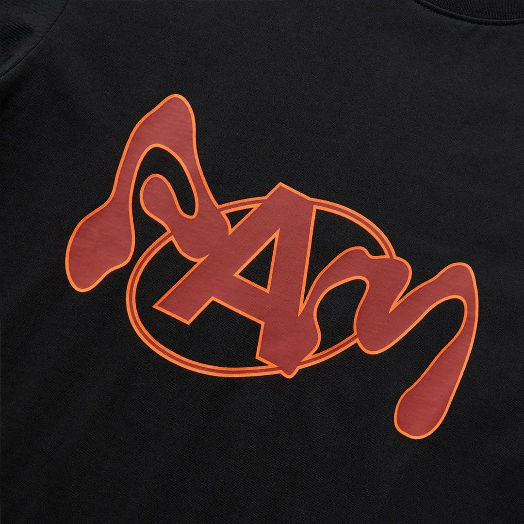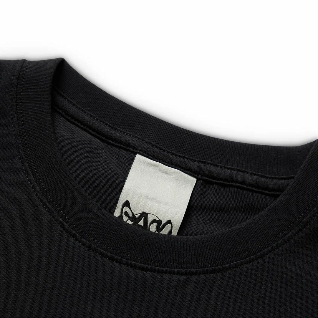 - Small folded double-logo label on back hem