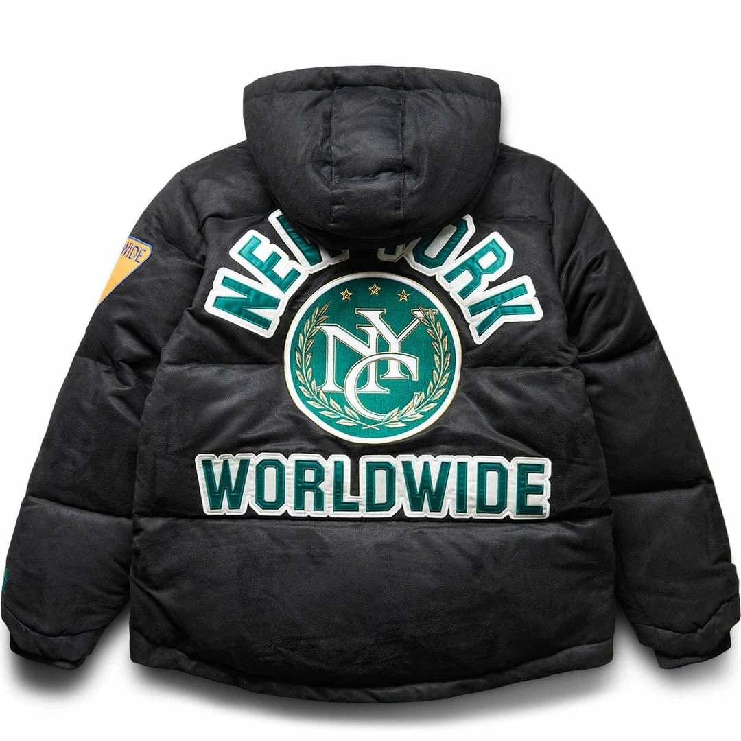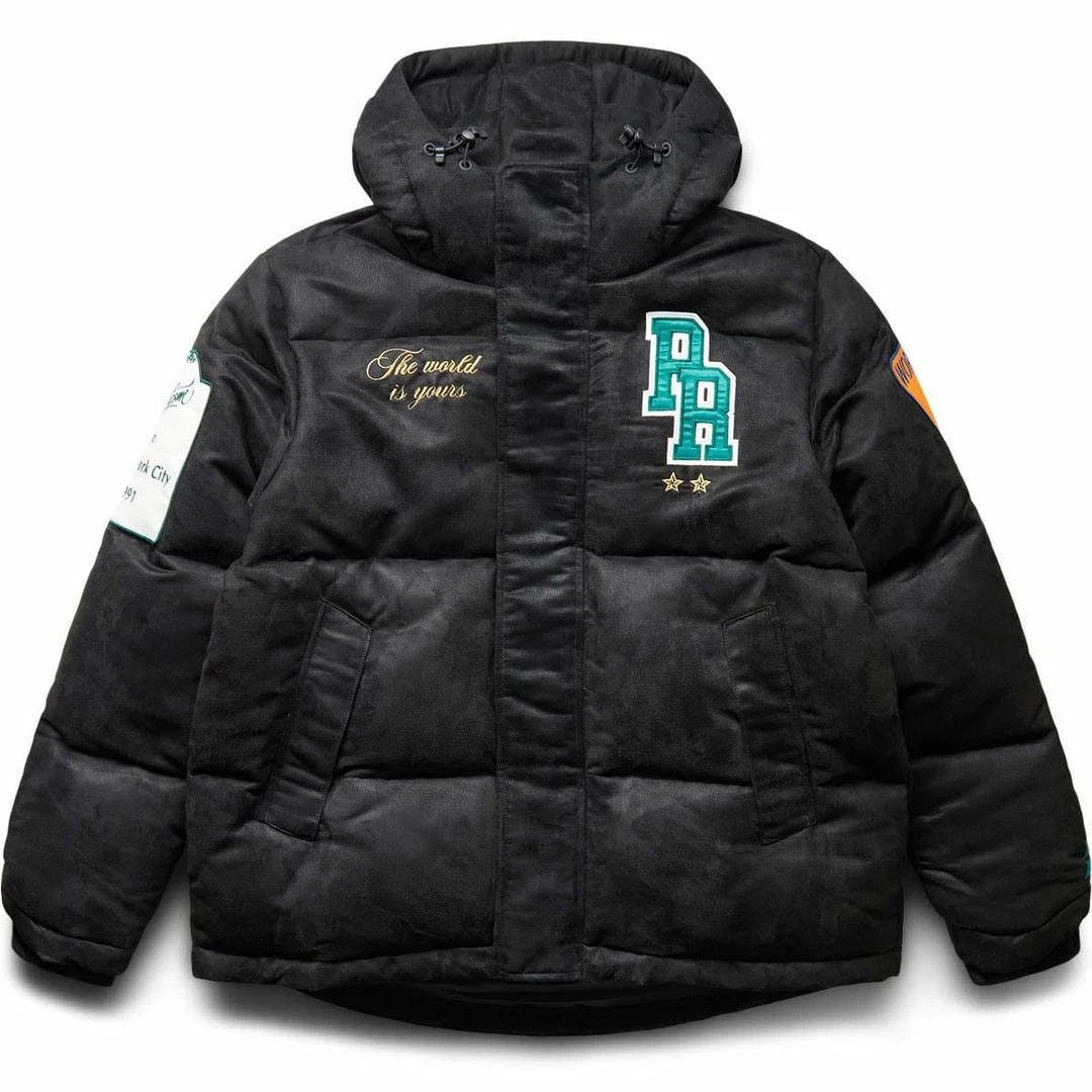 The PUMA X RHUIGI Faux Leather Down Jacket featuresΒ unique collegiate-style appliquΓ© throughout, paying homage to New York outerwear classics.