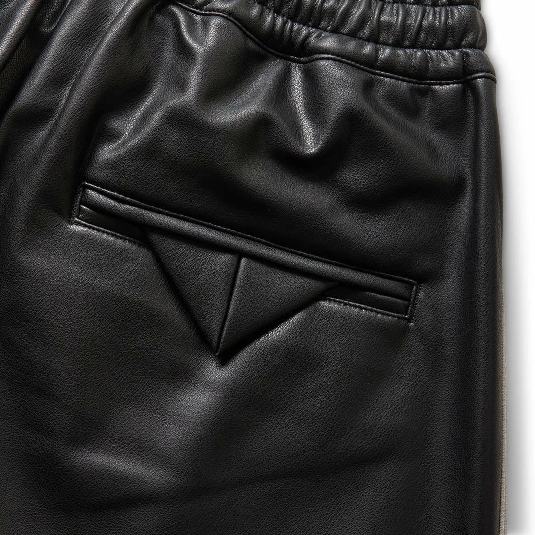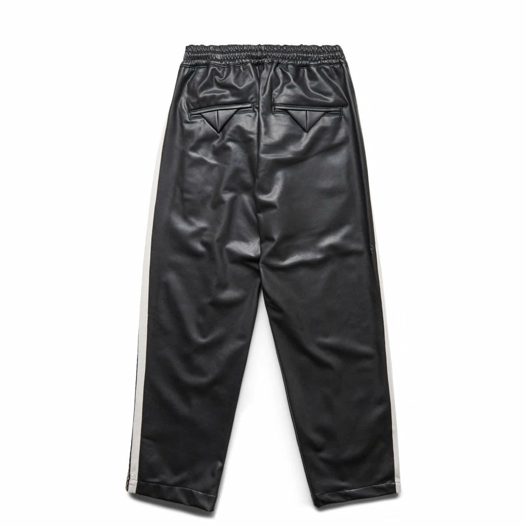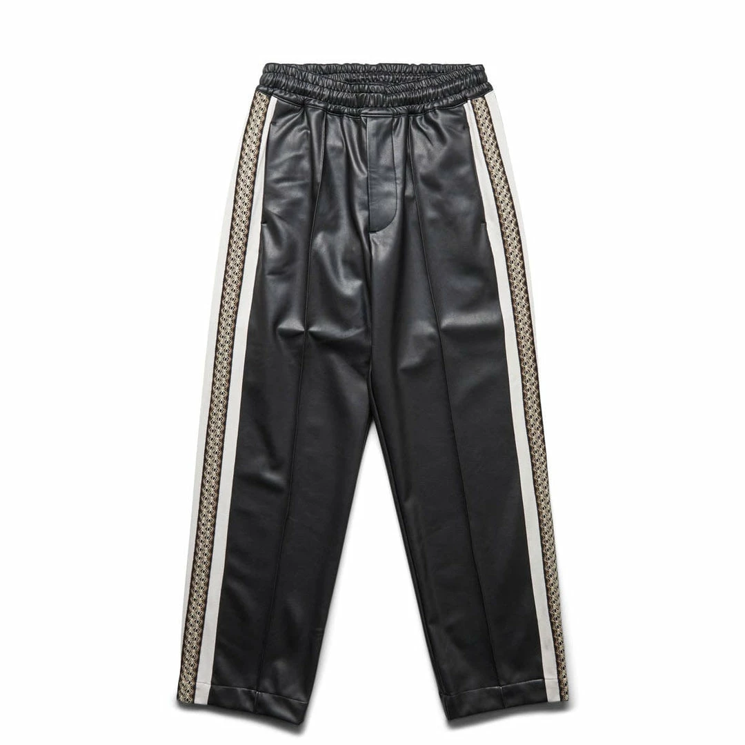 Sasquatchfabrix presents the Synthetic Leather Track Pants with embroidered lace trim.